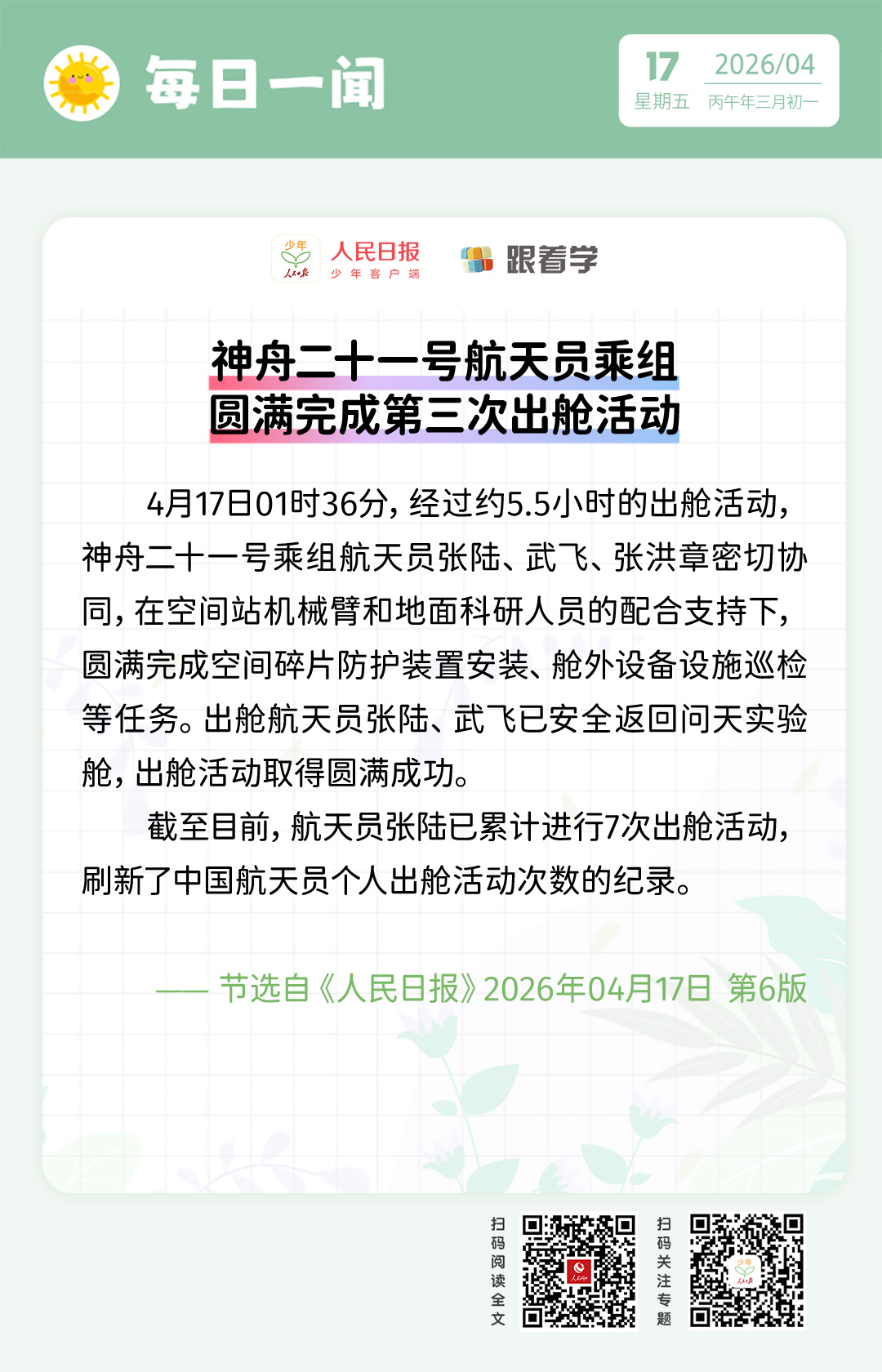 > 每日一闻丨神舟二十一号航天员乘组圆满完成第三次出舱活动
