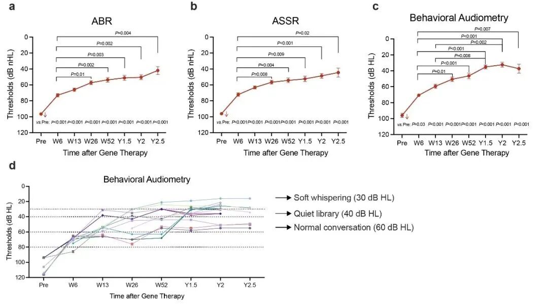 ▲ 治疗有效患者的 ABR、ASSR 及行为测听阈值(从给药前至随访 2.5 年)