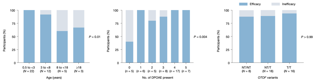 一是年龄,0.5 至 3 岁低龄患儿治疗有效率达 100%,未成年患者获益更显著;二是畸变产物耳声发射(DPOAE),作为评估耳蜗外毛细胞功能的重要指标,给药前在更多频率引出 DPOAE 反应的患者,治疗后听力恢复效果更好;三是基因突变类型,它会影响行为学测听阈值的恢复程度,但不影响治疗是否有效。相关发现为临床选择合适患者、制定个性化方案提供了依据。